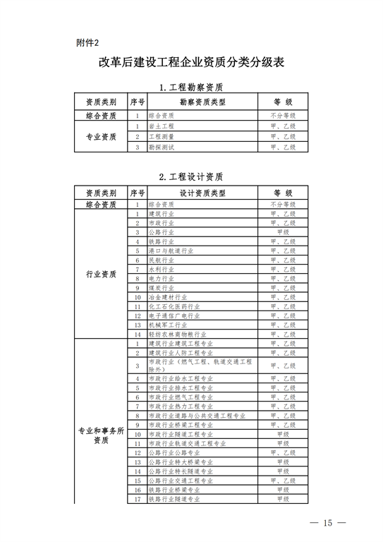 2.工程設(shè)計資質(zhì)。保留綜合資質(zhì);將21類行業(yè)資質(zhì)整合為14類行業(yè)資質(zhì);將151類專業(yè)資質(zhì)、8類專項資質(zhì)、3類事務(wù)所資質(zhì)整合為70類專業(yè)和事務(wù)所資質(zhì)。綜合資質(zhì)、事務(wù)所資質(zhì)不分等級;行業(yè)資質(zhì)、專業(yè)資質(zhì)等級原則上壓減為甲、乙兩級(部分資質(zhì)只設(shè)甲級)。